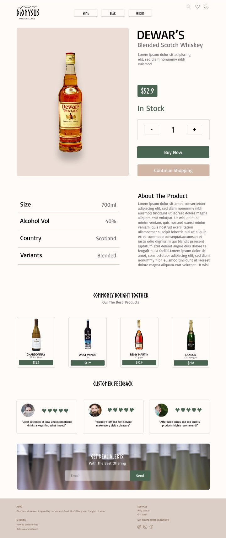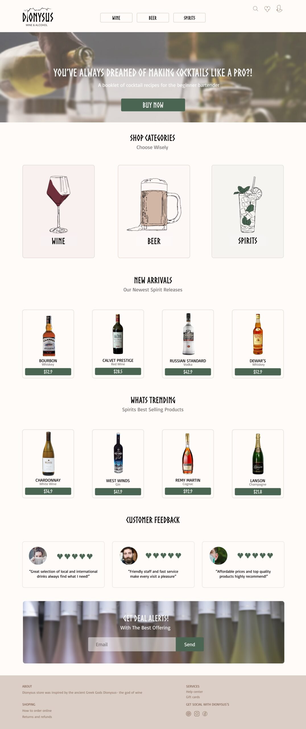 The homepage was designed for clarity and an intuitive shopping experience. I created clear navigation, highlighted key products, and added sections like trending items and reviews to build trust. Inspired by Dionysus, the Greek god of wine, the design includes classical typography, earthy colors, and minimal Greek-style illustrations.